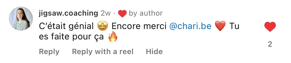 J'ai apprécié le fait qu'on y est allé étape par étape, en partant par les fondations en posant des mots sur nos valeurs, à qui on s'adresse et quel est le message qu'on veut faire passer. Et puis qu'on ai pu, filmer et monter nos vidéos pour repartir avec un résultat concret prêt à publier sur nos réseaux. J'ai aimé la taille du groupe qui a permis de chouettes échanges ainsi que ta disponibilité pour venir nous guider chacune dans nos hésitations ou questionnements.